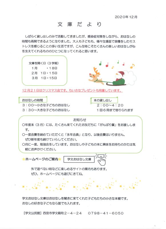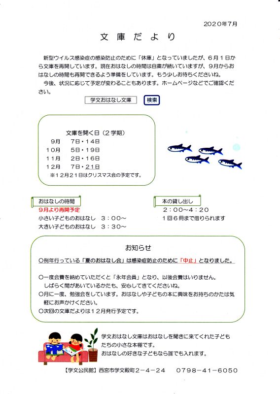 | 感染予防対策のため、本の貸し出しのみ。 | |||||